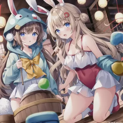 masterpiece,best q,2 girls,1 marshmallow,pounding steamed rice cake,pounding steamed marshmallow,[[[2 girls wear wood mallet]]],[[[hitting marshmallow with wood mallet]]],[[[wood mallet is very big size]]],[[[marshmallow is in wooden mortar]]],{2 girls wear cute rabbit hood},light brown hair ornament,shoulder length hair,side tail hair,kawaii,{kawaii},cute,{cute},story hat,cute school idle uniform,