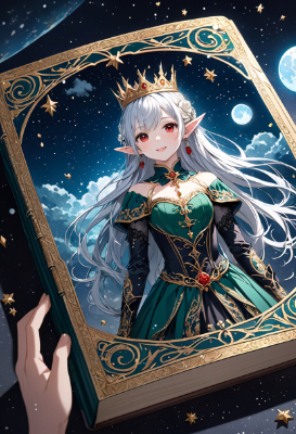 8K resolution,Atmosphere of fantasy:1,5, ((perfectly aligned fingers)),((cinematiclight,masterpiece,best quality,Ultra extremely detail everyone ,perfect anatomy,high-resolution,highres,extremely detailed,sharp focus)),((high-contrast:1.6,strong back-light, flower print)) ,((from front:1.5,extreme close-up ear:1.5 and extreme zoom-up ear, child elf wearing glossy decoration glitter gorgeous silk fabric gothic light-blue-color ballet-dress to with brilliant sequins,wearing very large gothic ribbon of rose form on head,see-through short-skirt ,white unserwear,wearing see-through tights ,wearing crown)),(best detailed red Eyes with Flashy mascara and reflection), (messy platinum white hair),elf ear with big red earrings ,wetting face,blush,enough lip with lipstick,Skin Gloss and skin is soaking wet, wet-lip:1.5,big hip,((bit opened mouth with smile)),small breasts,armpit ,Sweat,tatoo-art printed Skin Gloss at legs and body and face and arms,looking at viewer,BREAK,((spellbook of magic on floor,space,the universe,moon,starts)),BREAK,((magic effects of green wind)),BREAK,Cloudy,lightning,big Bubbles,BREAK,blooming white rose farm, <lora:hohoaka:1> <lora:make25d_type1_v100:1>,,,,
