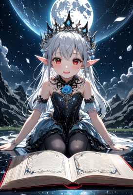 8K resolution,Atmosphere of fantasy:1,5, ((perfectly aligned fingers)),((cinematiclight,masterpiece,best quality,Ultra extremely detail everyone ,perfect anatomy,high-resolution,highres,extremely detailed,sharp focus)),((high-contrast:1.6,strong back-light, flower print)) ,((from front:1.5,extreme close-up ear:1.5 and extreme zoom-up ear, child elf wearing glossy decoration glitter gorgeous silk fabric gothic light-blue-color ballet-dress to with brilliant sequins,wearing very large gothic ribbon of rose form on head,see-through short-skirt ,white unserwear,wearing see-through tights ,wearing white hoodie, wearing crown)),(best detailed red Eyes with Flashy mascara and reflection), (messy platinum white hair),elf ear with big red earrings ,wetting face,blush,enough lip with lipstick,Skin Gloss and skin is soaking wet, wet-lip:1.5,big hip,((bit opened mouth with smile)),small breasts,armpit ,Sweat,tatoo-art printed Skin Gloss at legs and body and face and arms,spell magic and looking at viewer,BREAK,((spellbook of magic on floor,space,the universe,moon,starts)),BREAK,((magic effects of green wind)),BREAK,Cloudy,lightning,big Bubbles,BREAK,blooming white rose farm, <lora:hohoaka:1> <lora:make25d_type1_v100:1>,,