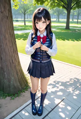(photorealistic:1.4), (RAW photo), masterpiece, best quality, extremely detailed, lady, (cyborg:1.2), neat and clean, elegant, polite, (shy:0.7), black medium length hair, almond eyes, (smile:0.7), (mechanical, metallic:1.4), slim fit, full sleeves, high necked, (matte silver puffer down bodysuit), (steel, iron:1.2) phosphorescent, (breastplate, shoulder protector, corset, long leather gloves, platform enamel long boots), standing pose, (high angle shot:0.7), dark night city, back alley