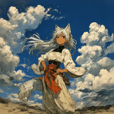 japanese anime, flat color, sunny day, transparent atmosphere, dynamical scene, beautiful queen, beautiful dark-skinned girl, wild girl, white japanese miko clothes, silk clothes, black neck undershirt, white hair, fox ears, thick eyebrows, happy, looking other side, --chaos 10 --sref 2647001089 --v 7 --stylize 400 --profile nqxtb7h