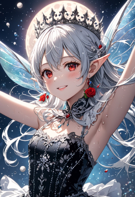 8K resolution,Atmosphere of fantasy:1,5, ((perfectly aligned fingers)),((cinematiclight,masterpiece,best quality,Ultra extremely detail everyone ,perfect anatomy,high-resolution,highres,extremely detailed,sharp focus)),((high-contrast:1.6,strong back-light, flower print)) ,((from back:1.5,extreme close-up ear:1.5 and extreme zoom-up ear, child elf wearing glossy decoration glitter gorgeous silk fabric gothic light-blue-color ballet-dress to with brilliant sequins,wearing corset, wearing very large gothic ribbon of rose form on head,see-through short-skirt ,white unserwear,wearing see-through tights ,wearing white hoodie, wearing crown)),(best detailed red Eyes with Flashy mascara and reflection), (messy platinum white hair),elf ear with big red earrings ,wetting face,blush,enough lip with lipstick,Skin Gloss and skin is soaking wet, wet-lip:1.5,big hip,((bit opened mouth with smile)),small breasts,armpit ,Sweat,tatoo-art printed Skin Gloss at legs and body and face and arms,standing and dancing and looking at viewer,BREAK,((spellbook of magic on floor,space,the universe,moon,starts)),BREAK,((magic effects of green wind)),BREAK,Cloudy,lightning,big Bubbles,BREAK,blooming white rose farm, <lora:hohoaka:1> <lora:make25d_type1_v100:1>,,