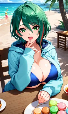 ultra detailed, top quality, masterpiece, aesthetic, beautiful face, beautiful eyes, cute eyes, shiny hair, (4fingers:0.7), 1girl, voluptuous body, large breasts, hitomi, brown hair, long hair, pink hairband, Katyusha, blue eyes, <lora:hitomiXL:0.6>, short corset bikini, red swimsuit, plaid bikini, strapless, happy, smile, open mouth, (lower body behind table:1.1), POV dating, cake on table, chocolate cake, on dish, terrace seats, beachside clubhouse, in resort area, add more details, <lora:Add_more_details_pony:0.4>, 16k, score_9, score_8_up, score_7_up