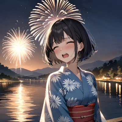 (masterpiece, best quality, ultra-detailed), 1girl, yukata, black hair, bob cut, black eyes, looking up, (fireworks in the sky), night, riverside, delicate smile, cinematic lighting, summer night, student model, detailed background, dramatic lighting