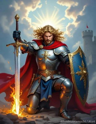 The graceful Archangel Gabriel, the angel who announces the Annunciation as God's messenger, has long silver hair flowing like a veil of light, wears a pure white robe and a blue mantle, holds a white lily in her hand, has a gentle and compassionate expression like that of the Virgin Mary, and is in an elegant pose kneeling on one knee to offer the flower. The pure color scheme of white, blue, and gold, and a sacred angle from above, with a garden bathed in morning light and falling petals in the background, a soft and delicate style reminiscent of the early Renaissance, and a warm halo of light that expresses hope and compassion.