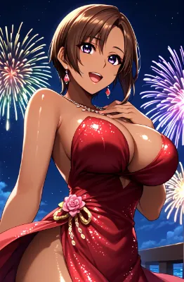 ultra detailed, top quality, masterpiece, aesthetic, high-res, absurdness, 16k, score_9, score_8_up, score_7_up, beautiful face, beautiful eyes, cute eyes, shiny hair, (4fingers:0.7), 1girl, voluptuous body, large breasts, doaxpatty, white hair, long hair, messy hair, antenna hair, blue eyes, dark skinned, <lora:doaxpatty-pdxl-nvwls-v1:0.6>, white dress, happy, open mouth, looking up, hand on breasts, cowboy shot, from below, fireworks, beach side, resort area, (night:1.1), add more details, <lora:Add_more_details_pony:0.4>