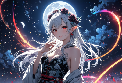 8K resolution,Atmosphere of fantasy:1,5, ((perfectly aligned fingers)),((cinematiclight,masterpiece,best quality,Ultra extremely detail everyone ,perfect anatomy,high-resolution,highres,extremely detailed,sharp focus)),((high-contrast:1.6,strong back-light, flower print)) ,((from back:1.5,extreme close-up ear:1.5 and extreme zoom-up ear, child elf wearing glossy decoration glitter gorgeous silk fabric gothic light-blue-color yukata to with brilliant sequins,wearing corset, wearing very large gothic ribbon of rose form on head,see-through short-skirt ,white unserwear,wearing see-through tights ,wearing white hoodie)),(best detailed red Eyes with Flashy mascara and reflection), (messy platinum white hair),elf ear with big red earrings ,wetting face,blush,enough lip with lipstick and wet,Skin Gloss and skin is soaking wet, wet-lip:1.5,big hip,((bit opened mouth with smile)),small breasts,armpit ,Sweat,tatoo-art printed Skin Gloss at legs and body and face and arms,standing and dancing and looking at viewer,BREAK,((fireworks,space,the universe,moon,starts)),BREAK,((magic effects of red fire)),BREAK,Cloudy,lightning,big Bubbles,BREAK,blooming white rose farm, <lora:hohoaka:1> <lora:make25d_type1_v100:1>,,