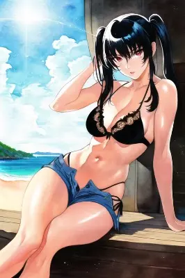 masterpiece, best quality, perspective, detailed, watercolor-inspired rendering, inked lines, realistic skin texture, solo, novel cover, captivating black-haired girl, glossy twin-tails, intense gaze, piercing eyes, seated position, mesmerizing beauty, meticulous depiction, subtle nuances, lifelike illustration, evokes a sense of realism, artistic excellence, striking composition, {powerful visual impact}, harmonious color scheme, expressive facial features, skillful art work, dramatic lighting, red eyes, around eyes sparkle, pupils sparkling, beautiful detailed eyes, {{, {short pants}, {fusion bikini}, {side-tie peek}, [upper cleavage], off-shoulder}}, captivating beauty, slender figure, confident posture, {groin}, navel, [[[[muscular]]]], shiny hair, sunlit, lifelike, {high-resolution image}, {courageous}, {dynamic standing pose, {sumlit, beach, 🏝}, detailed sexy, groinnether region, beautiful feet}, {{delicate wisps of hair, Delicate and intricate lines hair}}, {{{{400 mega pixels, hyperrealistic, sexy figure}}}}, {photoshop}, {delicate, portrait art works, official art works}, {{Shading, gravure pose}}, {{Photorealistic}}, {delicate black ink lines, porn star, Japan gravure},