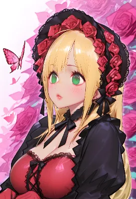 solo,ahoge,green eyes,blonde hair,blunt bangs,delicate face,detailed face,detailed skin,masterpiece,best quality,insanely detailed,beautiful,8k,photorealistic,(Traditional Classic Lolita Costume:1.7),(Classic Lolita Lace one-piece:1.6),(One Piece with lots of frills:1.5),(Delicate lace and gorgeous frills:1.9),(Gorgeous and delicate classic lolita fashion:2.1),(delicate and luxurious Lolita head dress:2.1),(High-quality gloves made of delicate lace:2.1),(Long eyelashes:1.5),(soft gradient eyeshadow:1.5),(lustrous lipstick),(Realistic rose garden background:1.8),(Five beautiful butterflies fluttering:1.7),(A sight to behold:2.2),(extravagance:2.1) , , , <lora:hime_style-1.0r8:0.7> <lora:menositanikuma2:0.7> <lora:sanDka1:0.8> <lora:eyecolle_sumire_v100:0.8>