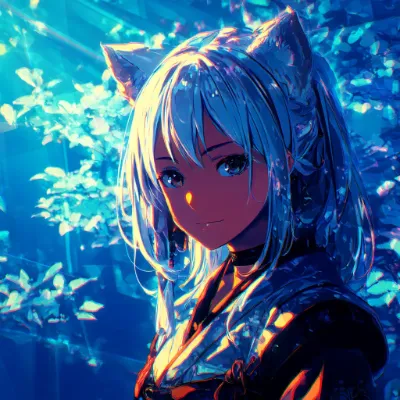 japanese anime, flat color, sunny day, transparent atmosphere, dynamical scene, beautiful queen, beautiful dark-skinned girl, wild girl, white japanese miko clothes, silk clothes, black neck undershirt, white hair, fox ears, thick eyebrows, happy, looking other side, --chaos 10 --sref 2670340649 --v 7 --stylize 400 --profile nqxtb7h