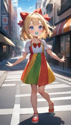 2girls,loli,child,first girl (blond hair:1.2),short hair,bob hair,(blue eyes:1.1),(hair bow:1.4),(red bow:1.3),second girl black hair,short hair,dark eyes,both happy expression,bright smile,excited look,sparkling eyes,small chest,flat chest,colorful dresses,frilly clothing,cute outfits,both standing,jumping pose,arms raised up,(both hands holding colorful candy:1.4),(lollipops:1.3),(wrapped sweets:1.2),(candy in hands:1.3),multiple candies,rainbow colored candy,shiny candy wrappers,candy wrappers scattered around,outdoor park setting,green grass,blue sky,white clouds,playground in background,sunny day,cheerful atmosphere,dynamic pose,feet slightly off ground,hair flowing with movement,joyful energy,candy focused composition,(masterpiece:1.2),(best quality:1.2),(very aesthetic:1.1),(absurdres:1.1),