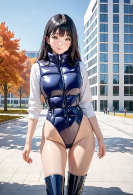 (photorealistic:1.4), (RAW photo), masterpiece, best quality, extremely detailed, lady, neat and clean, elegant, polite, (shy:0.9), black medium length hair, almond eyes, (smile:0.9), slim fit, hooded, high necked, closed zipper, (shiny dark orange short puffer down jacket, glossy leather shorts, platform long rubber boots), standing pose, middle angle shot, cold early autumn, park, grassland, brook, ginkgo trees, copse