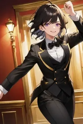 最高傑作、高品質、恋人(男性、黒髪短髪、目は紫色)(女性、茶髪ロング、目はマゼンタ)、ダンス、ワルツ