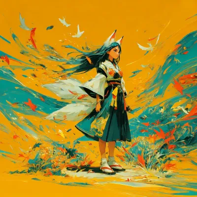 japanese anime, flat color, sunny day, transparent atmosphere, dynamical scene, beautiful queen, beautiful dark-skinned girl, wild girl, white japanese miko clothes, silk clothes, black neck undershirt, white hair, fox ears, thick eyebrows, happy, looking other side, --chaos 10 --sref 3688762158 --v 7 --stylize 400 --profile nqxtb7h
