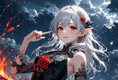 8K resolution,Atmosphere of fantasy:1.5, ((perfectly aligned fingers)),((cinematiclight,masterpiece,best quality,Ultra extremely detail everyone ,perfect anatomy,high-resolution,highres,extremely detailed,sharp focus)),((high-contrast:1.6,strong back-light, flower print)) ,((from_back:1.5,from-below:1.5,extreme close-up finger:1.5 and extreme zoom_up Shoulder,little child elf wearing see-through blue shirt with long-sleeved with rolling-up sleeves, sleeves and Appeared wrist and brilliant sequins, wearing very large gothic ribbon of rose,white unserwear,wearing see-through tights)),((best detailed red Eyes with eyeshadow:1.5 and Flashy mascara and reflection,eyeshadow)), (messy platinum white hair),((nail-art with flower-print)),elf ear with big red earrings ,wetting face,blush,enough lip with lipstick and wet,smile,Skin Gloss and skin is soaking wet, wet-lip:1.5,big hip,small breasts,armpit ,Sweat,tatoo-art printed Skin Gloss at legs and body and face and arms,lying on skateboard and looking at viewer,raise-hand and lying,BREAK,((skateboard,magic effects of red fire)),BREAK,Cloudy,lightning,Bubbles,BREAK,blooming white rose farm, <lora:hohoaka:1> <lora:make25d_type1_v100:1>,,