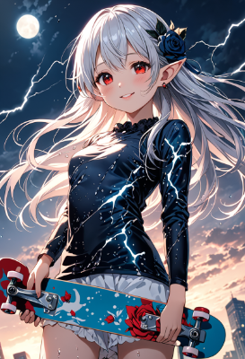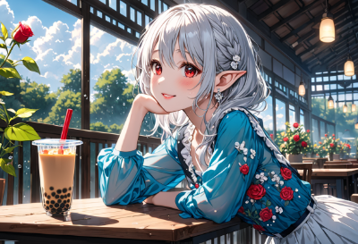 8K resolution,Atmosphere of fantasy:1.5, ((perfectly aligned fingers)),((cinematiclight,masterpiece,best quality,Ultra extremely detail everyone ,perfect anatomy,high-resolution,highres,extremely detailed,sharp focus)),((high-contrast:1.6,strong back-light, flower print)) ,((from-below:1.5,extreme and extreme zoom_up lip,child elf wearing see-through blue shirt with sleeves and brilliant sequins, wearing very large gothic ribbon of rose,white unserwear,wearing see-through tights)),((best detailed red Eyes with eyeshadow:1.5 and Flashy mascara and reflection,eyeshadow)), (messy platinum white hair),elf ear with big red earrings ,wetting face,blush,enough lip with lipstick and wet,smile,Skin Gloss and skin is soaking wet, wet-lip:1.5,big hip,small breasts,armpit ,Sweat,tatoo-art printed Skin Gloss at legs,handing bubble-tea and looking at viewership ,BREAK,((TAPIOKA,bubble-tea on the table)),BREAK,Cloudy,lightning,Bubbles,BREAK,blooming white rose farm, <lora:hohoaka:1> <lora:make25d_type1_v100:1>,,,