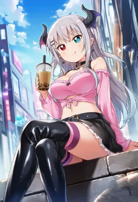 masterpiece, best quality, solo, 1girl, silver hair, very long hair, two side up, demon, horns, tail, (pink crop top, bare midriff,navel:1.2), (suspender skirt:1.2), , happy, (large breasts:1.3), (cleavage:1.2),smile, cute, outdoors, standing on ground, urban background