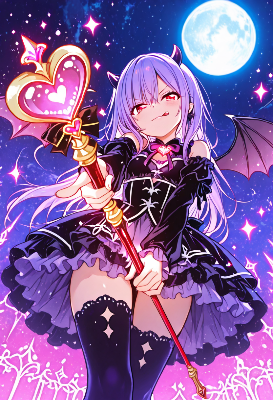 She crosses her legs and holds a black scepter with a golden orb, pointing it forward toward the viewer, exuding queen-like authority.