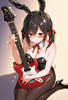 She is wearing a sharp black suit with a white shirt and a red bow tie, along with knee-high black boots.
