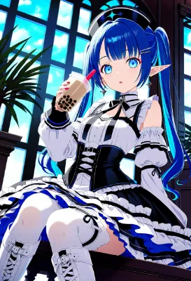 青い髪のエルフ少女が、緑豊かな庭園のベンチに腰掛け、頰を赤らめて座っている。彼女は森の古い屋敷で働くメイドで、忙しい日常から逃れ、魔法の花々が咲くこの場所で一息つく。ふと耳を澄ませば、風が運ぶ不思議な囁き声が聞こえてくる。彼女の瞳には、どんな冒険が映っているのだろうか? 読み手は彼女の秘密を探りたくなるはず。