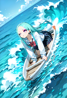 anime style, masterpiece, ultra high quality, ultra-detailed, 4k resolution, high resolution, full body, solo, 1girl, gyaru, long straight hair, aqua hair, forehead, school uniform, closed one eye, cheeky gaze, looking ahead, eyeshadow, barefoot, room shoes, fluffy fabric slipper, movement motion lines:1.2, sense of depth, dutch angles, convenient angles:1.2