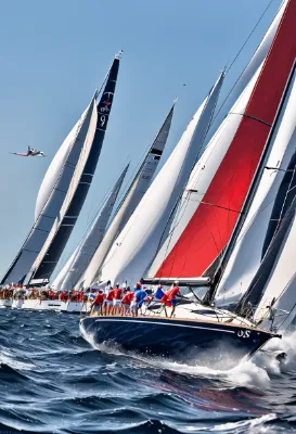 広大な青い海を切り裂くように進む帆船。アメリカ国旗を掲げた船体が、黒い帆を張り、波を蹴立てて疾走する。遠くに他の船影が見え、まるでレースの真っ只中。船長は幼い頃の夢を胸に、未知の地平を目指す。この瞬間、風と波が織りなす冒険の物語が始まる。太陽の光が海面を輝かせ、自由への旅を祝福するかのように。