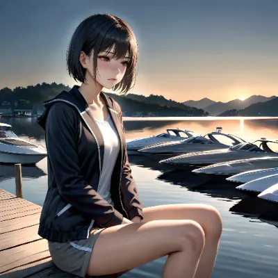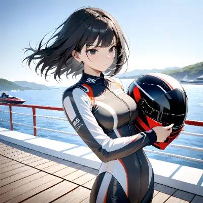 (masterpiece, best quality, high resolution, photorealistic), 20-year-old Japanese model, slender body, black bob haircut, wearing stylish race queen outfit (short skirt, crop top, gloves), standing near racing boats, playful smile, holding parasol, sparkling water reflections, glamorous pose, sunny day, vibrant atmosphere