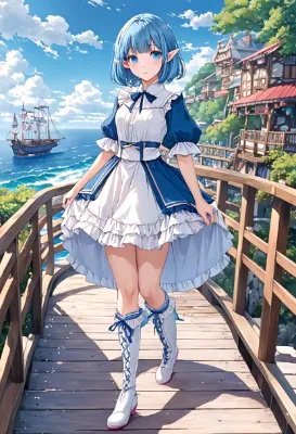 森の奥深く、青い髪のエルフメイドが忙しい日常から抜け出し、水辺のベンチに腰を下ろす。足を冷たい水に浸し、遠くの山々を眺めながら、ふと訪れた穏やかな風に心を委ねる。彼女の瞳には、冒険への憧れが宿り、日常の喧騒を忘れた瞬間が広がる。もしかすると、この静かな場所で新たな出会いが待っているのかもしれない。読み手は彼女の物語を想像せずにはいられない。