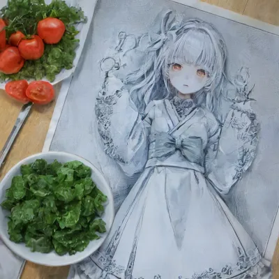 「ふう、ニンジン食べながらお絵描きしよっか…」とおっとり呟く緑髪の少女。床に横たわり、野菜の皿を横目にスケッチを眺め、リラックスした表情で日常の小さな楽しみを味わう様子が可愛らしい。(あとでストーリー仕立てのタイトルを自動生成してどうなるかみたかったですがストーリー仕立てのタイトルを生成してくれません)