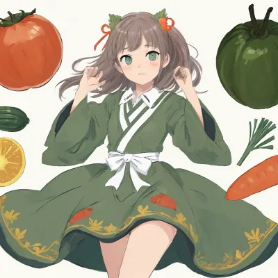 The collar features embroidery of little carrots and tomatoes. In her hair, she's wearing a large white ribbon along with several mini tomato-shaped pins.