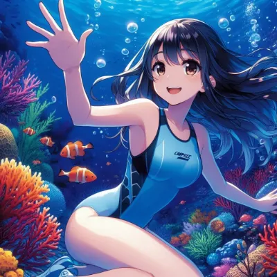 Detailed anime-style image of a girl of Asian descent unable to hold her breath while swimming at the bottom of the Coral Sea in night. She is wearing a sleek competitive sleeveless skyblue swimsuit and has flowing black hair with high ponytail. She appears to be exhaling or struggling underwater, with many air bubbles escaping from her mouth. She closes eyes. She is completely upside down. Best Quality.