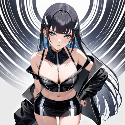 Today's Solaris outfit is a black off-the-shoulder top with a black miniskirt. The skirt has loads of metallic silver zips on it, giving it a slightly futuristic feel. Around the neckline, I'm wearing futuristic metallic mechanical accessories. My hairstyle is straight, long black hair with a blunt fringe. A blunt fringe can look a bit childish, but Solaris is rather good at pulling off a mature look. , <lora:noline:1> <lora:hairdetailer:1>,