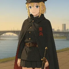 士官学校の校庭には、夏の太陽が容赦なく降り注いでいた。半袖体操服の学生たちは汗をぬぐいながら、無秩序に走り回っている。しかし、彼女――ブロント少尉――の存在は、まるで別の世界からやってきたかのようだった。 黒の長袖セーラー服にロングスカート、黒タイツに軍用ブーツ。そして戦前陸軍憲兵風のイカマントに赤い腕章。手にはヨーヨーを握り、真剣な顔で立つ彼女の姿は、まさに「校庭の異物」だった。 「少尉、夏なのにその格好は服装規定違反です。さっさと着替えないと営倉行きですよ」 小柄で黒髪ボブの富士見軍曹が、タイトスカートの夏服姿で近づき、厳しい目で告げる。 少尉は一瞬、目を細めた。「これは正義の制服ですので……規定違反ではありません」と、真顔で答える。 その瞬間、イカマントの裾が風にヒラリと翻り、地面に何かが滑り落ちた。 パサリ。 富士見軍曹の目が点になる。少尉のマントの下から、少女マンガのコミック本が落ちたのだ。表紙には大きく「Sukeban Yo-Yo」と書かれており、描かれた少女は少尉にそっくり……だが微妙に違う。金髪のロングポニーテールに黒セーラー服、黒タイツ、そしてヨーヨーを構える戦闘ポーズ。まるでコミックの世界から飛び出したような誇張された可愛さだ。 「……少尉、そのマンガは一体……?」 富士見軍曹が呆れた声を上げる。だが少尉はまったく動揺せず、静かに前かがみになってマンガを拾い上げる。 「これは……現実の記録です。ノンフィクションですので」 遠くの方で、村上伍長(海兵曹長)は腕を組んで苦笑する。 「嬢ちゃん……そのノンフィクションは誰も信じねぇぞ……」 少尉はマントを整え、ヨーヨーを片手に再び構えた。 校庭の学生たちは困惑と笑いと尊敬の入り混じった表情で、夏の日差しの中、異様な軍人少女を見上げる。 少尉の心の声が、微かにだが確かに響いた。 「少年少女たちよ……この真実を、受け止めるのです……」 そして、『スケバンヨーヨー』のコミック本は、太陽の光を受けて地面に微かに輝き、少尉の異様さと少女マンガの世界を同時に映し出していた。