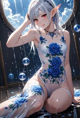 8K resolution, ((perfectly aligned fingers)),((cinematiclight,masterpiece,best quality,Ultra extremely detail everyone ,perfect anatomy,high-resolution,highres,extremely detailed,sharp focus)),((high-contrast:1.6,strong back-light, flower print)) ,((from-below:1.5,extreme zoom_up face,child elf wearing see-through blue silk-cloth with sleeves and brilliant sequins, wearing very large gothic ribbon of rose,white unserwear)),((best detailed red Eyes with eyeshadow:1.5 and Flashy mascara and reflection,eyeshadow)), (messy platinum white hair),elf ear with big red earrings ,wetting face,blush,enough lip with lipstick and wet,smile,Skin Gloss and skin is soaking wet, wet-lip:1.5,big hip,small breasts,armpit ,Sweat,tatoo-art printed Skin Gloss at legs,bend legs on the floor,looking at viewer ,BREAK,((bakery)),Cloudy,lightning,Bubbles,BREAK,blooming white rose farm, <lora:hohoaka:1> <lora:make25d_type1_v100:1>
