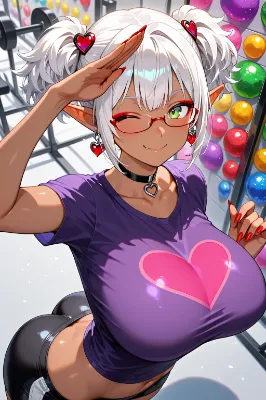 BREAK very cute and beautiful japanese 1girl, solo,BREAK curvy, (big breasts:1.4), (huge buttocks:1.2), 8 heads tall, (dark skin:1.4),BREAK baby face, seductive smile expression, closed mouth, (blush:1.2), fang, makeup,BREAK (big round drooping green eyes:1.2), (red eyeshadow:1.2), bob cut white hair, fantasy world elf ears, heart-shaped frame pierced earrings, ((long nails:1.2), red nail polish), heart-shaped hairpin,BREAK two pieces large devil wings on waist, devil horns on side of head,