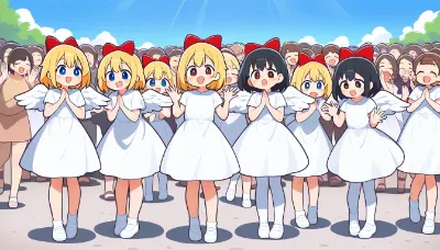 1girl,solo,(blonde hair:1.2),(short hair:1.1),(bob hair:1.1),(blue eyes:1.2),gentle smile,innocent expression,(hair bow:1.4),(red bow:1.3),angel costume,white dress with flowing fabric,(white feathered wings:1.3),golden halo above head,white stockings,white shoes,walking pose,one foot forward,arms swinging naturally,looking ahead with curiosity,city street background,urban setting,sidewalk,buildings on both sides,street lamps,peaceful daytime atmosphere,soft sunlight,anime style,pastel colors,(masterpiece:1.2),(best quality:1.2),(very aesthetic:1.1),(absurdres:1.1),