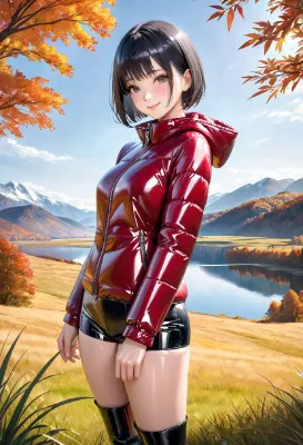 (photorealistic:1.4), (RAW photo), masterpiece, best quality, extremely detailed, lady, neat and clean, elegant, polite, (shy:0.9), black hair long bob cut, almond eyes, (smile:0.9), slim fit, hooded, high necked, closed zipper, (shiny purplish dark red short puffer down jacket), leather shorts, platform knee high rubber boots, standing pose, (high angle shot:0.6), grassland, alpine plants, mountain village, steep rocky mountains in the background, cold early spring