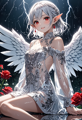 8K resolution, ((perfectly aligned fingers)),((cinematiclight,masterpiece,best quality,Ultra extremely detail everyone ,perfect anatomy,high-resolution,highres,extremely detailed,sharp focus)),((high-contrast:1.6,strong back-light, flower print)) ,((from-below:1.5,extreme zoom_up face,child elf wearing see-through angel-coat with sleeves and brilliant sequins, wearing very large gothic ribbon of rose,white unserwear)),((best detailed red Eyes with eyeshadow:1.5 and Flashy mascara and reflection,eyeshadow)), (messy platinum white hair),elf ear with big red earrings ,wetting face,blush,enough lip with lipstick and wet,smile,Skin Gloss and skin is soaking wet, wet-lip:1.5,big hip,small breasts,armpit ,Sweat,tatoo-art printed Skin Gloss at legs,((sitting on the floor with angel-wing)),looking at viewer ,BREAK,,Cloudy,lightning,Bubbles,BREAK,blooming white rose farm, <lora:hohoaka:1> <lora:make25d_type1_v100:1>