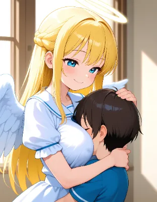 (angel girl, hugging shota:1.2), (onee-shota:0.8), long hair, kawaii angel wings, blonde hair, white clothes, (girly tone, cute mood:0.7), (erogaki smile, dosukebe body, erotic mood, before sex:0.7), love, happy, holy soft lighting, loli face,