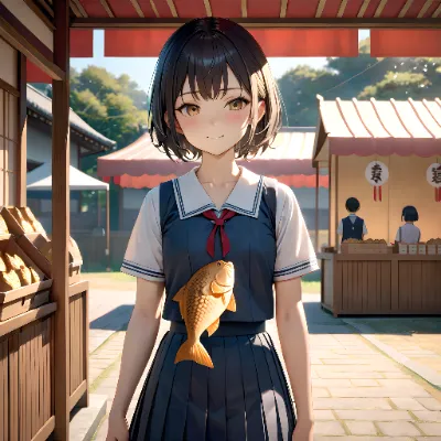 室内でリラックスした表情の女の子がたい焼きを持っているイラスト。明るい窓辺の背景。