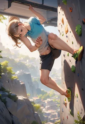 深い森に囲まれた岩壁に挑む少女。汗を流しながら一歩ずつ登る彼女の瞳には、頂上で待つ未知の景色への憧れが輝く。幼い頃の挫折を乗り越え、今、彼女の冒険が始まる。風が髪をなびかせ、手が次のホールドを掴む瞬間、自由への扉が開く。どんな物語が頂上で待っているのだろうか?