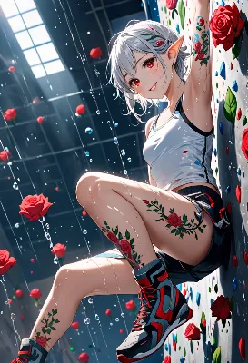 8K resolution, ((perfectly aligned fingers)),((cinematiclight,masterpiece,best quality,Ultra extremely detail everyone ,perfect anatomy,high-resolution,highres,extremely detailed,sharp focus)),((high-contrast:1.6,strong back-light, flower print)) ,((from-below:1.5,extreme zoom_up face,child elf wearing see-through climing-wear with sleeves and brilliant sequins, wearing very large gothic ribbon of rose,white unserwear,ear cuff)),((best detailed red Eyes with eyeshadow:1.5 and Flashy mascara and reflection,eyeshadow)), (messy platinum white hair),elf ear with big red earrings ,wetting face,blush,enough lip with lipstick and wet,smile,Skin Gloss and skin is soaking wet, wet-lip:1.5,big hip,small breasts,armpit ,Sweat,tatoo-art printed Skin Gloss at legs,looking at viewer and Wall climbing ,BREAK,indoor climbing gym ,Cloudy,lightning,Bubbles,BREAK,blooming white rose farm, <lora:hohoaka:1> <lora:make25d_type1_v100:1>