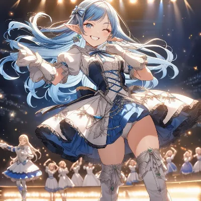 古い城の庭園で、青い髪のメイド少女が優雅に踊る。花火が夜空を彩る中、彼女は日常の喧騒を忘れ、秘密の夢を追いかける。後ろでは仲間たちが微笑み、華やかな宴の始まりを予感させる。この瞬間、少女の心は自由に羽ばたき、城の伝説が息づくような不思議な夜の物語が紡がれる。あなたもこの幻想的な世界に浸ってみては?