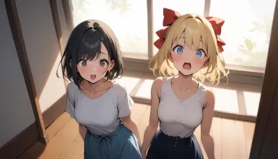 1girl,solo,(loli:1.2),(blonde hair:1.1),(short hair:1.1),(bob hair:1.1),(hair bow:1.3),(red bow:1.3),(blue eyes:1.2),round eyes,innocent expression,small breasts,white dress,frilly dress,short sleeves,standing,one hand holding perfume bottle,perfume bottle pointing toward chest,spraying perfume,delicate hands,indoor room,vanity table,mirror in background,soft lighting,window light,elegant bedroom,anime style,cell shading,(masterpiece:1.3),(best quality:1.3),(very aesthetic:1.2),(absurdres:1.1),