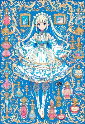 青い髪をなびかせた少女が、ピンクのドレスに身を包み、部屋に散らばる魔法の香水瓶を眺めている。彼女の日常は、甘い香りとハートのアクセサリーに満ちた冒険の始まり。小さなピンク髪の妖精がそっと寄り添い、二人で織りなす秘密の物語。香水の一滴が、夢のような世界への扉を開く瞬間。少女の瞳に映るのは、甘く切ない恋の予感か、それとも未知の魔法の旅か?読み手の心をくすぐる、幻想的な一幕。