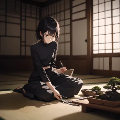 sitting gracefully in a traditional tatami room, soft natural sunlight filtering through shoji screens,
