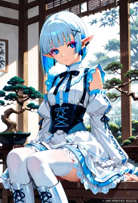 プールの端に立つ青い髪のエルフ少女。彼女は古代の森からやってきたスイマーで、水の精霊と語らう力を持つ。今日も競泳水着に身を包み、ゴーグルを調整しながら、未知の深みに挑む。太陽の光が水面を輝かせ、彼女の瞳に冒険の炎が宿る。果たして、この泳ぎがもたらす物語とは? 彼女の日常は、森と水の境界で繰り広げられるファンタジーだ。