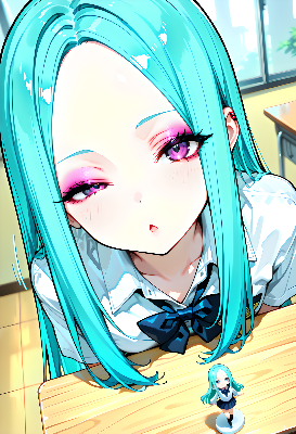 masterpiece, ultra high quality, ultra-detailed, high resolution, 4k, anime style (1.2), 1girl, solo focus (1.2), gyaru, long straight hair, aqua hair, half closed eye, cheeky gaze (1.1), school uniform, forehead, eyeshadow, chestnut mouth, holding a chainsaw (1.2), engine vibration, smoke, movement motion lines (1.2), sense of depth, dutch angles (1.1), convenient angles (1.2), outdoors, foreground paintbrush rack, bonsai, matsu