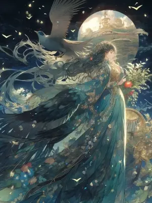 緑豊かな森に住まう猫獣人の狩人。植物で作られた緻密で美しい装飾を身に着けている。鮮やかな色彩の輝く瞳。鬱蒼とした森に月の光が差し込み照らしている。詳細な描き込み。鮮やかな色彩。高画質。