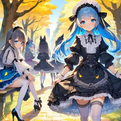 青い髪の少女が、古い城の庭園を散策する。色づく紅葉とカボチャが散らばる道を、セーラードレスを翻しながら歩む彼女。噴水の水音が響く中、ふと見つけた不思議な花に手を伸ばす。もしかすると、この庭園には隠された魔法の秘密が? 秋の風が運ぶ冒険の予感に、心躍る少女の日常の一コマ。読み手は彼女の次なる発見を想像してみて。